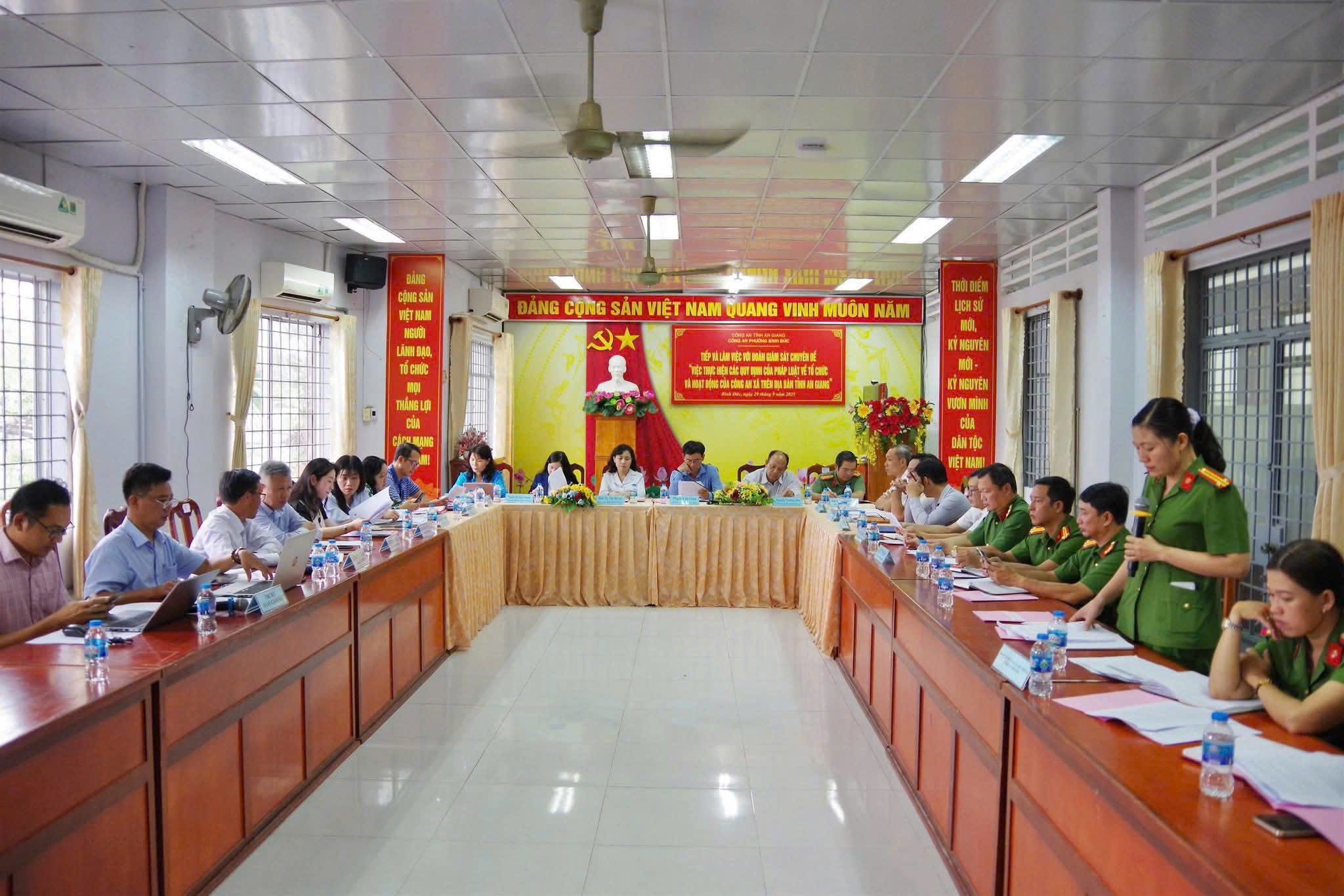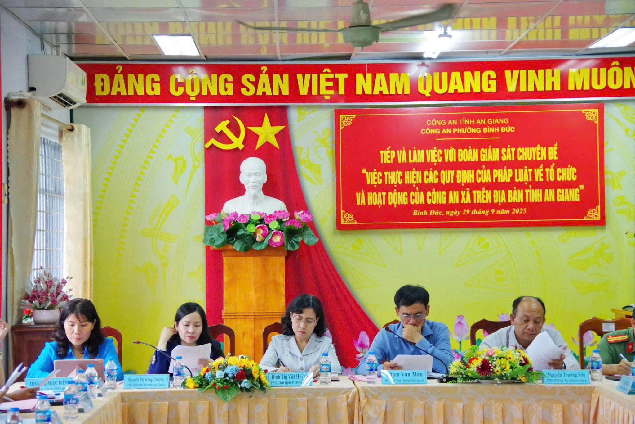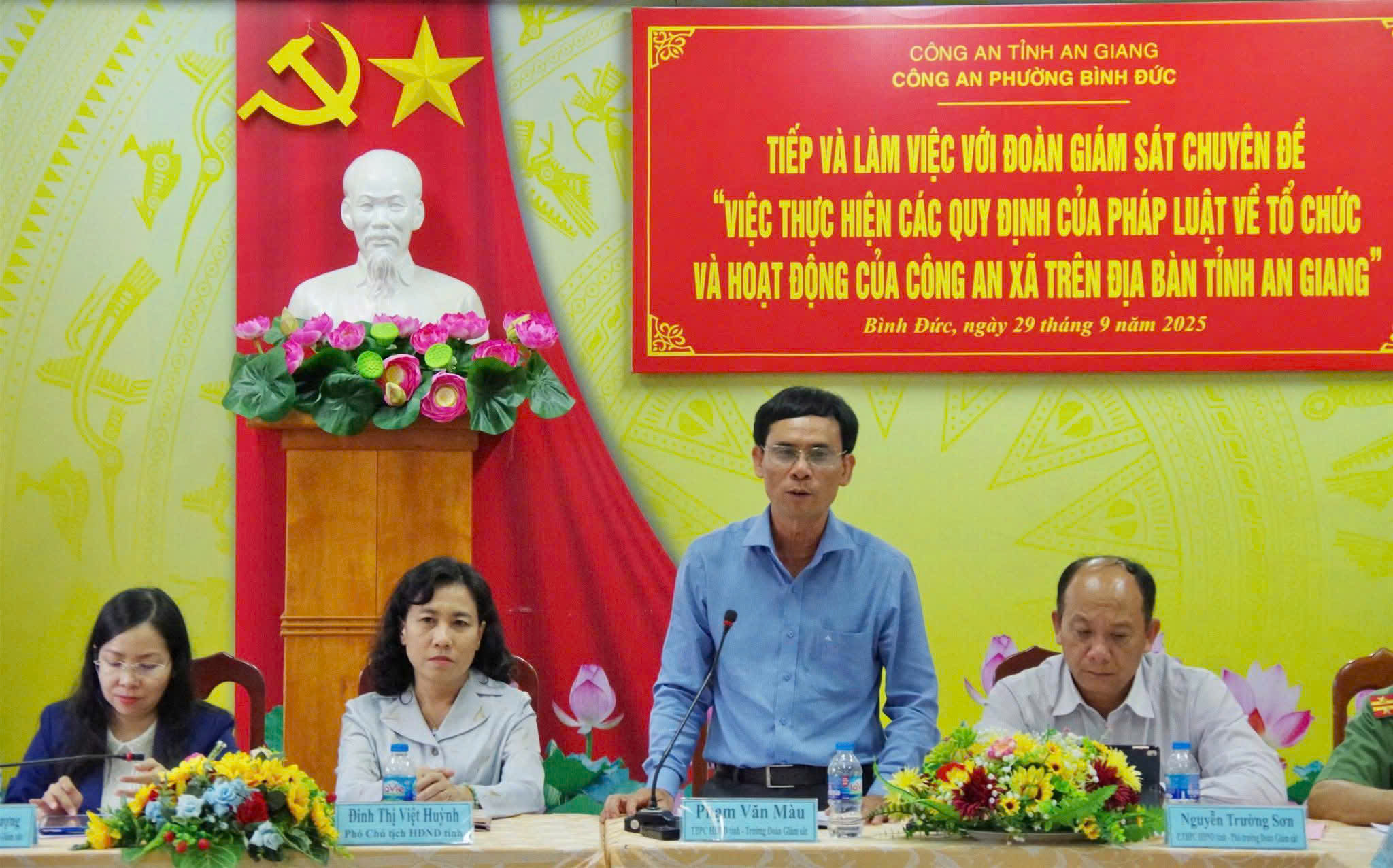 Chiều ngày 29/9, Đoàn giám sát của Ban Pháp chế Hội đồng nhân dân tỉnh An Giang do ông Phạm Văn Màu, Ủy viên Thường trực, Trưởng Ban Pháp chế HĐND tỉnh làm trưởng đoàn, đã có buổi giám sát chuyên đề “Việc thực hiện các quy định pháp luật về tổ chức và hoạt động của Công an cấp xã trên địa bàn tỉnh An Giang” tại phường Bình Đức, tỉnh An Giang. Cùng đi với đoàn có bà Đinh Thị Việt Huỳnh, Tỉnh ủy viên, Phó Chủ tịch HĐND tỉnh. Đại tá Lê Văn Quý, Tỉnh ủy viên, Phó Giám đốc Công an tỉnh. Bà Nguyễn Thị Liêm, Phó Bí thư Đảng ủy Ủy ban nhân dân tỉnh. Tiếp đoàn có bà Trần Thị Ngọc Diễm, Tỉnh ủy viên, Bí thư Đảng ủy – Chủ tịch HĐND phường Bình Đức. Lãnh đạo UBND phường. Ban chỉ huy Công an phường, cùng lực lượng cán bộ, chiến sĩ và thành viên Tổ Bảo vệ an ninh trật tự ở cơ sở trên địa bàn.