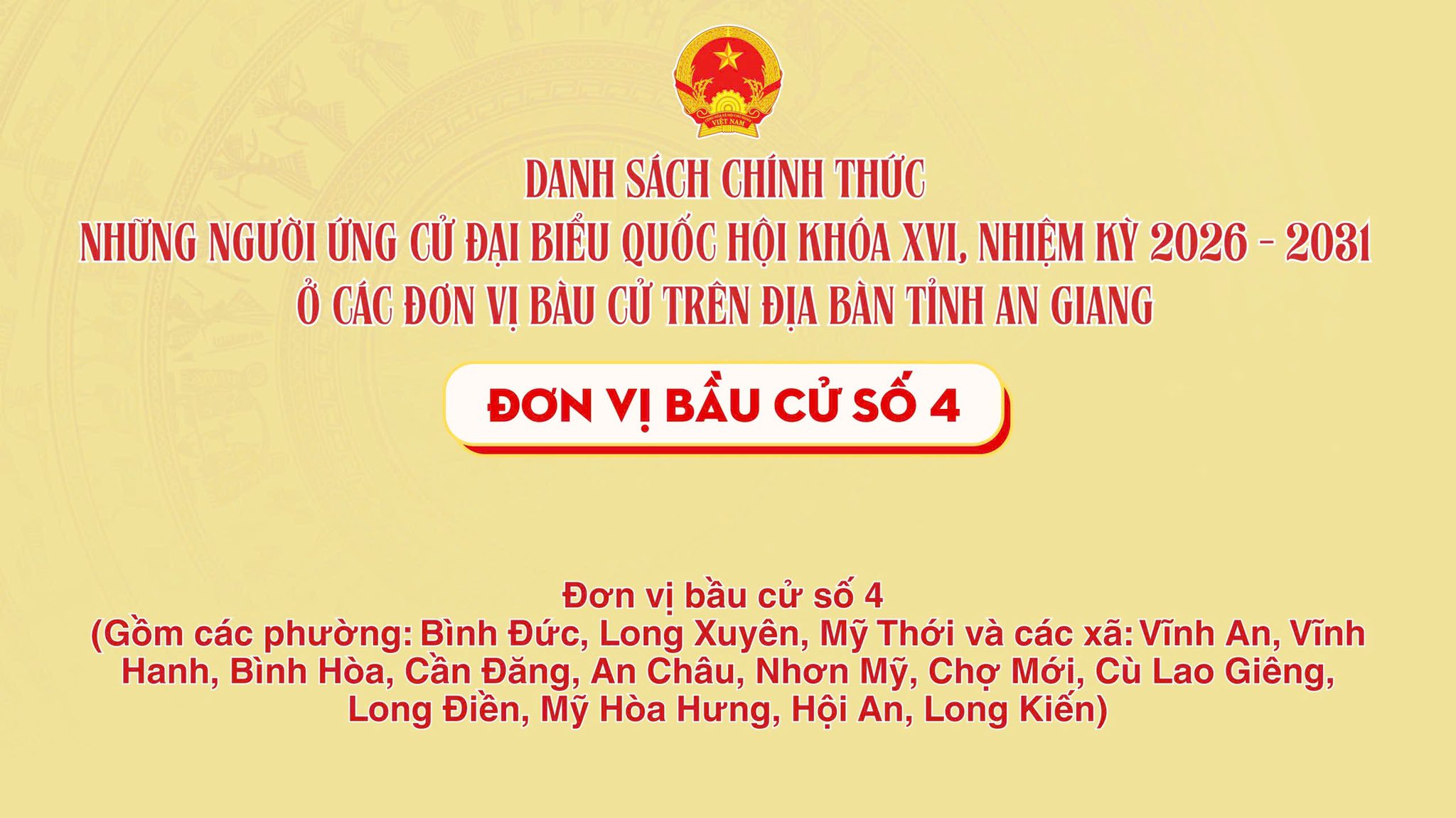 Trong đó, Đơn vị bầu cử số 4 gồm các phường: Bình Đức, Long Xuyên, Mỹ Thới và các xã: Vĩnh An, Vĩnh Hanh, Bình Hòa, Cần Đăng, An Châu, Nhơn Mỹ, Chợ Mới, Cù Lao Giêng, Long Điền, Mỹ Hòa Hưng, Hội An, Long Kiến.