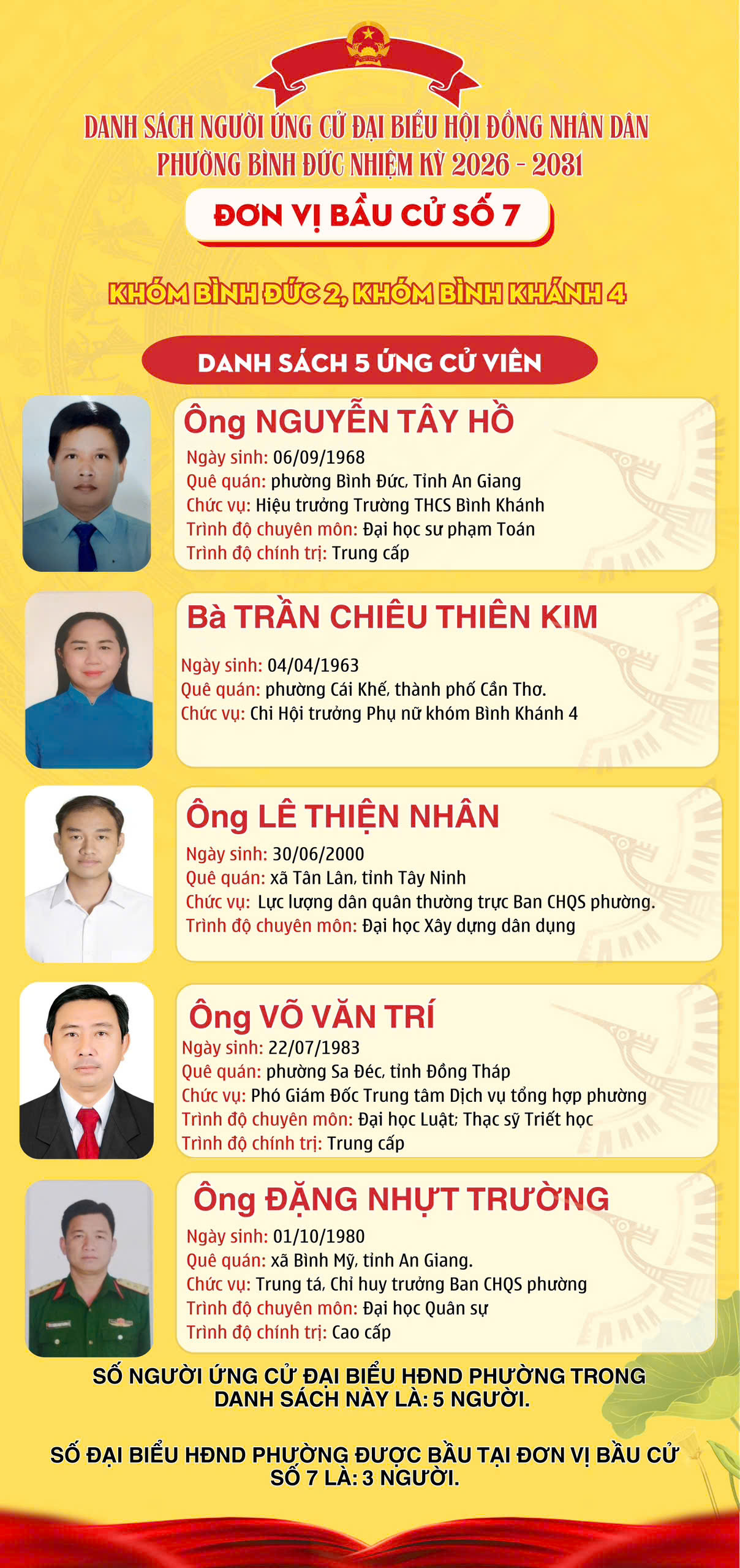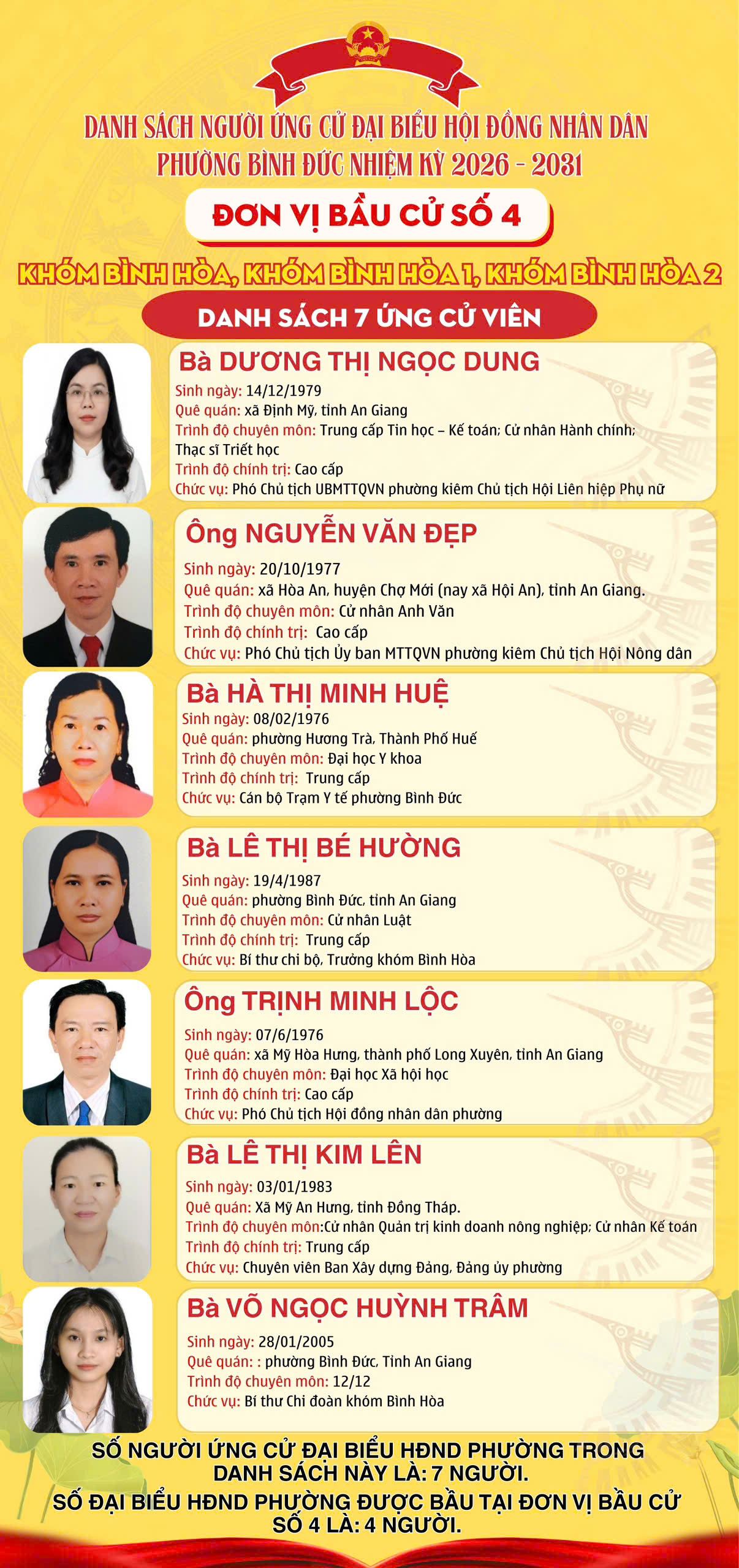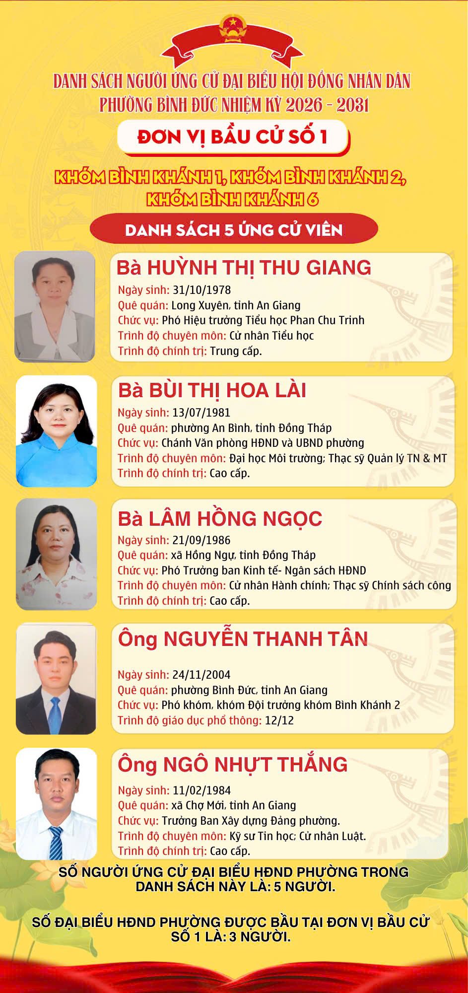 DANH SÁCH ĐƠN VỊ BẦU CỬ VÀ SỐ LƯỢNG ĐẠI BIỂU HỘI ĐỒNG NHÂN DÂN PHƯỜNG BÌNH ĐỨC NHIỆM KỲ 2026 – 2031