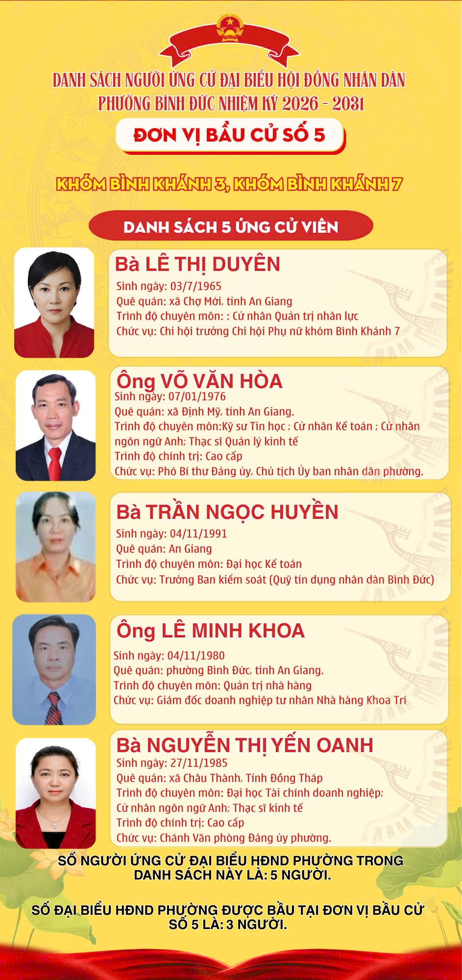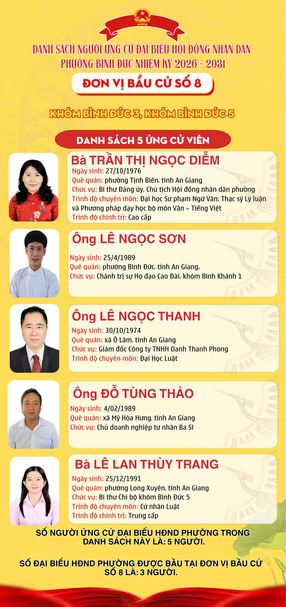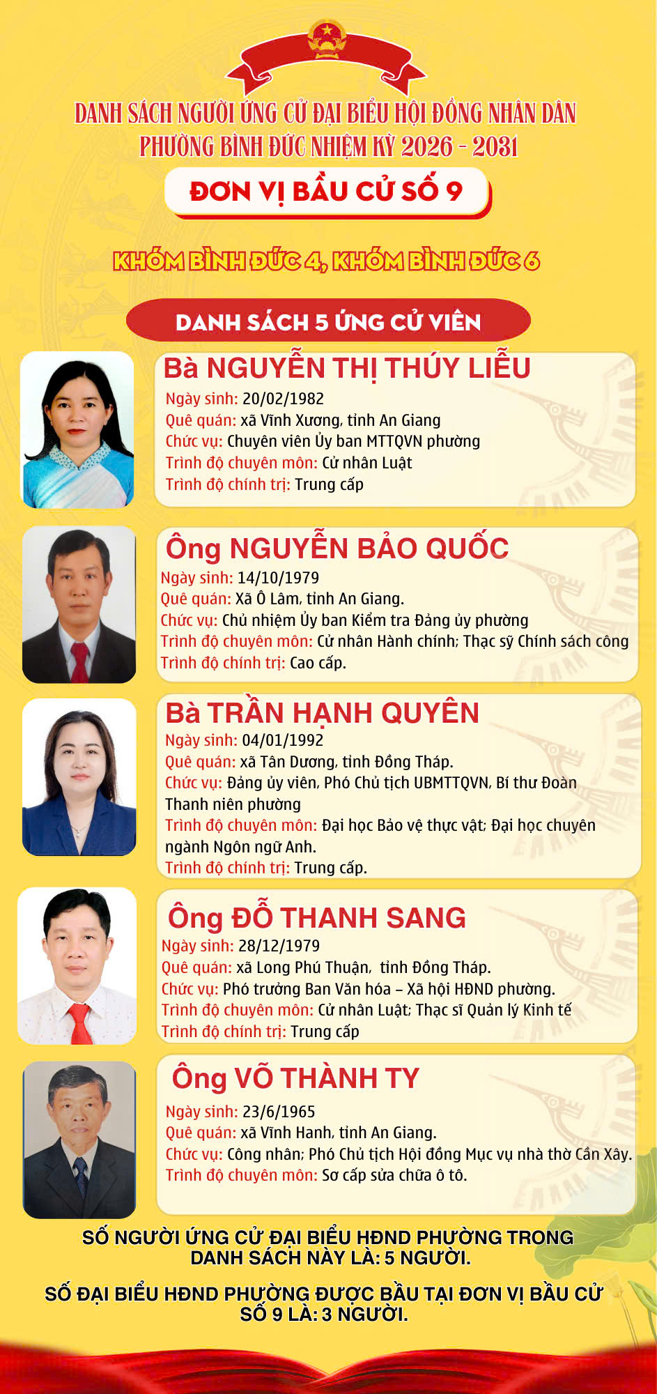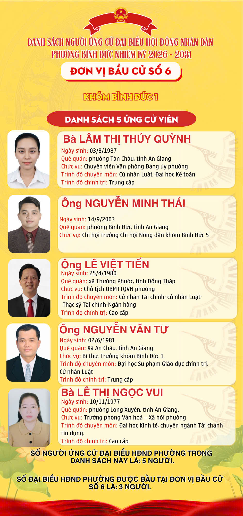 DANH SÁCH ĐƠN VỊ BẦU CỬ VÀ SỐ LƯỢNG ĐẠI BIỂU HỘI ĐỒNG NHÂN DÂN PHƯỜNG BÌNH ĐỨC NHIỆM KỲ 2026 – 2031