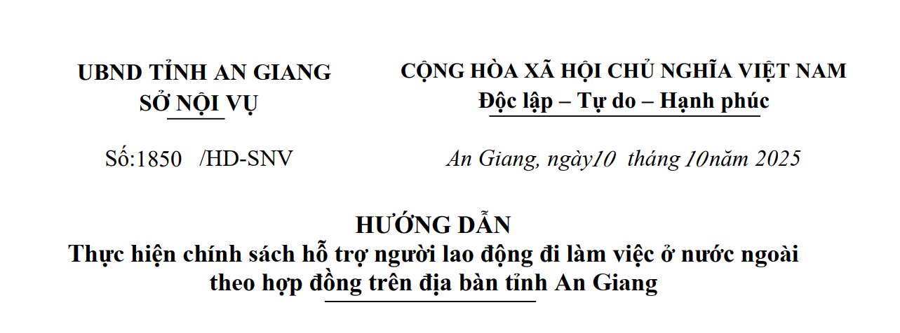 Sở Nội vụ tỉnh An Giang có hướng dẫn thực hiện chính sách hỗ trợ người lao động đi làm việc ở nước ngoài theo hợp đồng trên địa bàn tỉnh An Giang, như sau: