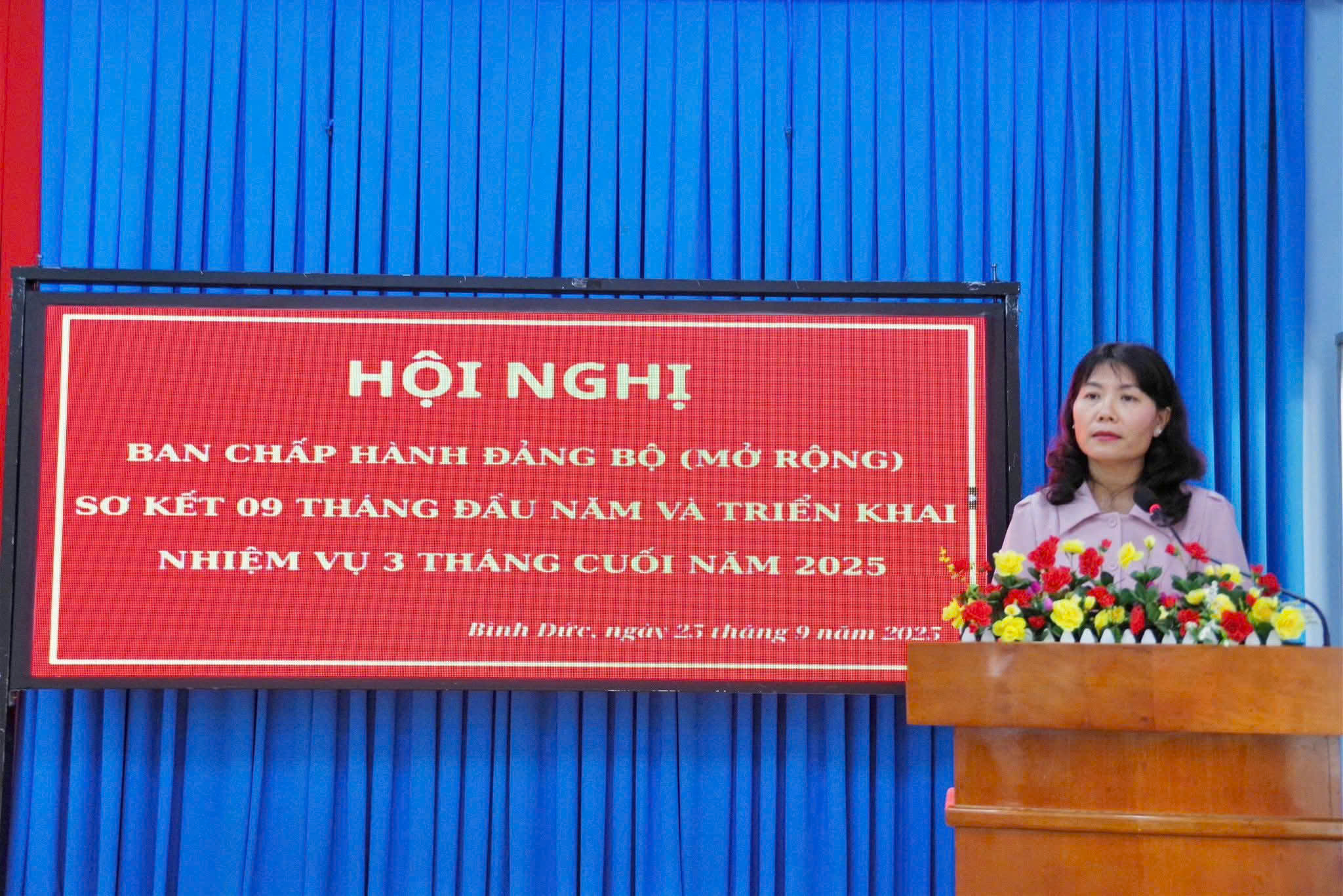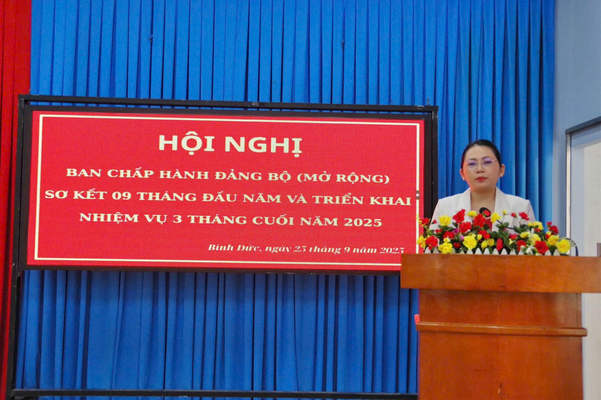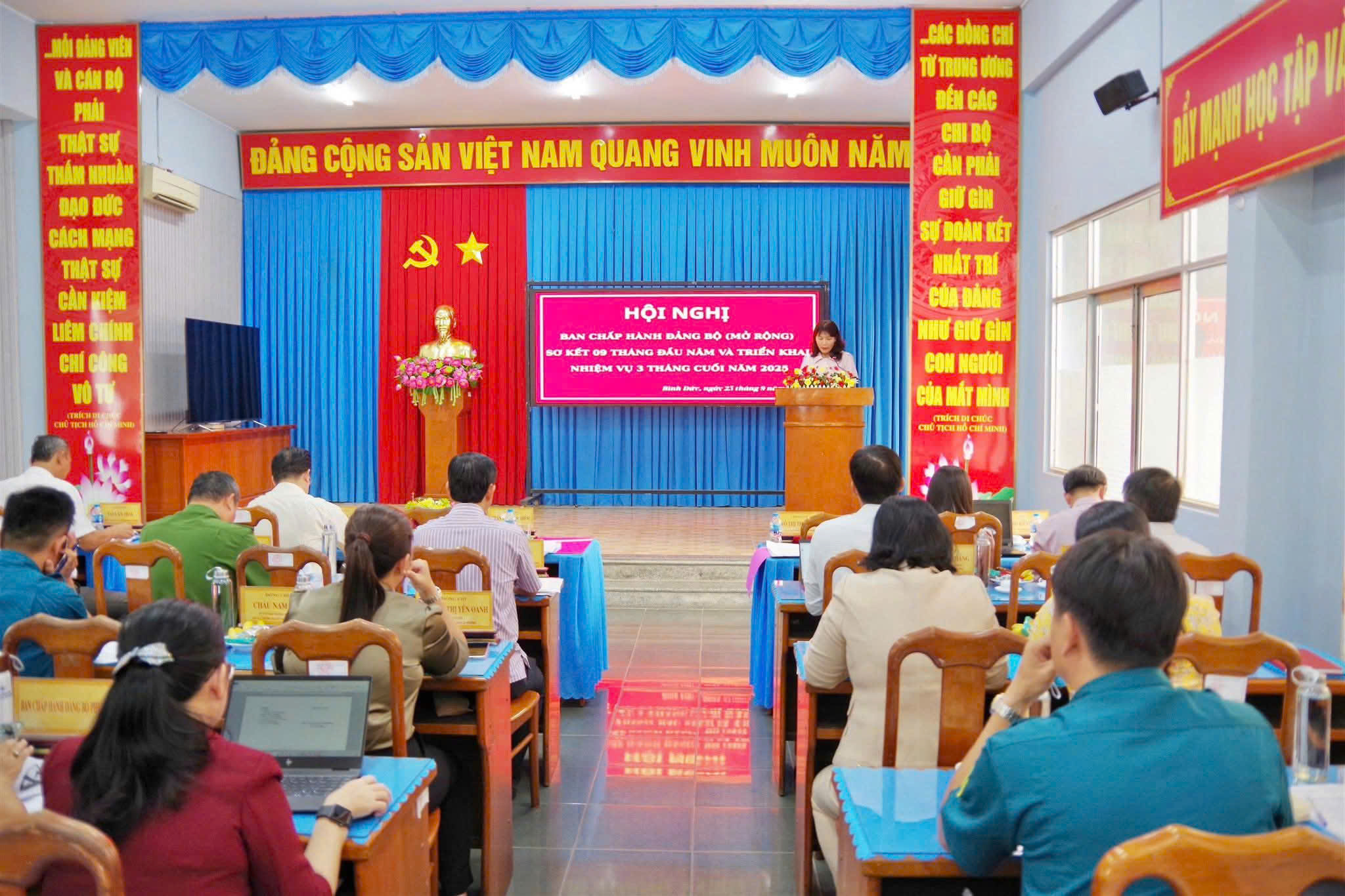 Sáng ngày 25/9, Ban thường vụ Đảng ủy phường Bình Đức, tỉnh An Giang tổ chức hội nghị Ban chấp hành Đảng bộ mở rộng, nhằm sơ kết công tác thực hiện nhiệm vụ chính trị 09 tháng đầu năm và triển khai phương hướng, nhiệm vụ cuối năm 2025. Đồng chí Trần Thị Ngọc Diễm - Tỉnh ủy viên, Bí thư Đảng ủy phường, Chủ tịch HĐND phường chủ trì hội nghị. Cùng tham dự và phát biểu chỉ đạo hội nghị có đồng chí Phạm Hoàng Nam - Ủy viên Ban thường vụ Tỉnh ủy, Trưởng Ban tổ chức Tỉnh ủy.