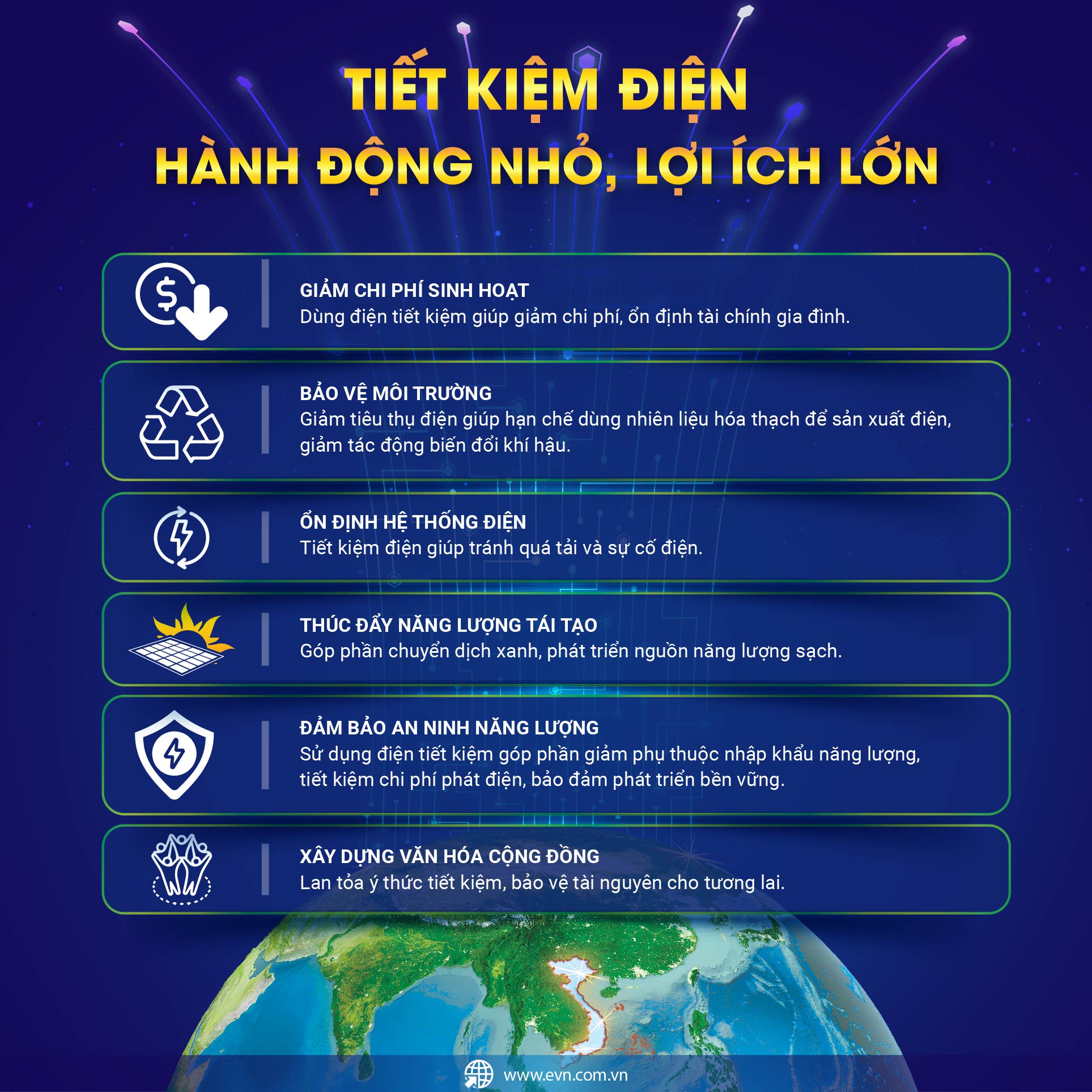 Chiến dịch Giờ Trái đất không chỉ dừng lại ở việc tắt đèn trong một giờ, mà còn khuyến khích mỗi tổ chức, mỗi gia đình, mỗi cá nhân duy trì thói quen sử dụng điện tiết kiệm, lựa chọn các giải pháp năng lượng thân thiện môi trường, ứng dụng sáng kiến xanh trong đời sống và sản xuất.