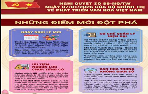 Ngày 07/01/2026, Ban Chấp hành Trung ương đã ban hành Nghị quyết số 80-NQ/TW của Bộ Chính trị về phát triển văn hóa Việt Nam, nhằm khẳng định phát triển văn hóa, con người là nền tảng, nguồn lực nội sinh quan trọng, động lực to lớn, trụ cột, hệ điều tiết cho phát triển nhanh và bền vững đất nước. Văn hóa Việt Nam là kết tinh những giá trị tốt đẹp của dân tộc trong tiến trình hàng nghìn năm dựng nước và giữ nước; là nguồn lực nội sinh quan trọng hun đúc trí tuệ, tâm hồn, khí phách và bản lĩnh người Việt Nam. Trong thời kỳ đổi mới đất nước, tư duy và nhận thức về vai trò của văn hoá tiếp tục có những bước phát triển mới. Thể chế, chính sách được quan tâm, từng bước hoàn thiện. Nguồn lực đầu tư cho phát triển văn hoá được tăng cường. Công nghiệp văn hoá đang trên đà phát triển. Các giá trị văn hoá thấm sâu vào mọi mặt của đời sống xã hội, khơi dậy truyền thống yêu nước, củng cố niềm tin và sức mạnh đại đoàn kết toàn dân tộc. Hội nhập quốc tế về văn hoá ngày càng được mở rộng, góp phần nâng cao tiềm lực, vị thế, uy tín, sức mạnh mềm của quốc gia.