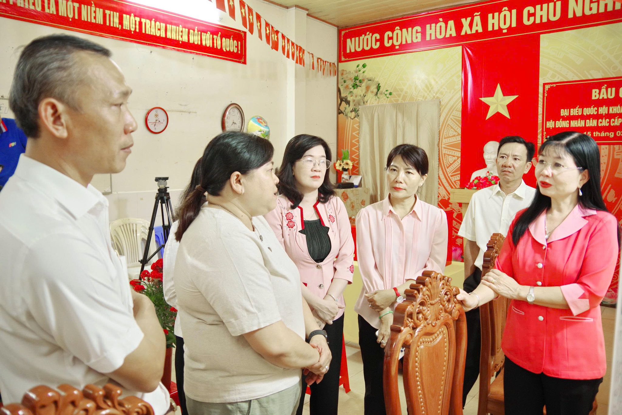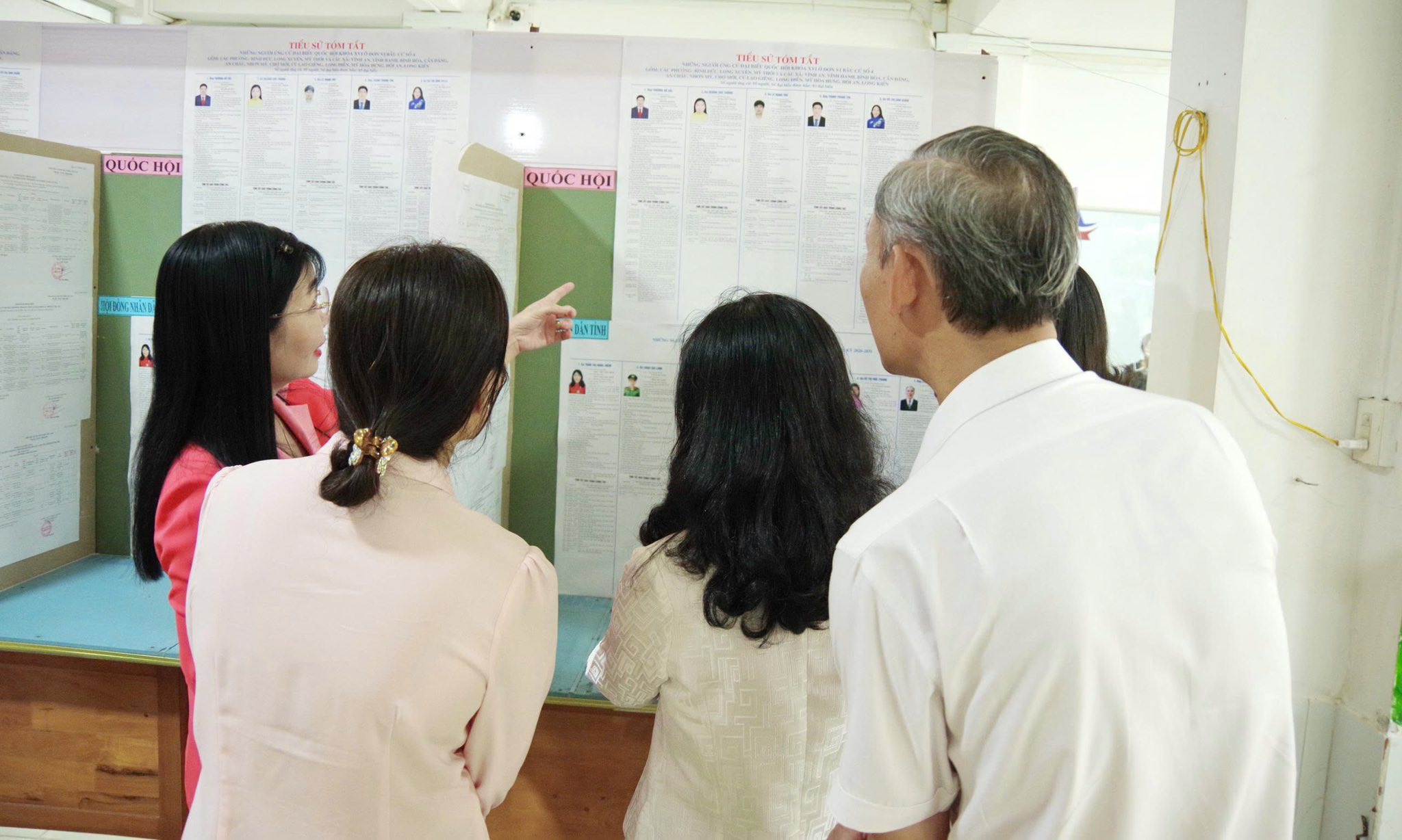 Đoàn kiểm tra thực tế tại khu vực bỏ phiếu số 13 thuộc khóm Bình Khánh 3 và khu vực bỏ phiếu số 8 đặt tại trường Mầm non Học viện Hoa Kỳ, khóm Bình Khánh 5. Tại các điểm đến, đoàn kiểm tra việc niêm yết danh sách cử tri, bố trí khu vực bỏ phiếu, công tác trang trí khánh tiết, cũng như việc chuẩn bị cơ sở vật chất phục vụ ngày bầu cử.