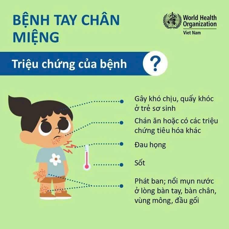 Triệu chứng thường gặp gồm sốt, đau họng, quấy khóc, chán ăn và nổi mụn nước ở tay, chân, vùng mông. Bệnh hiện chưa có thuốc đặc trị, đa số tự khỏi sau 10 đến 14 ngày.