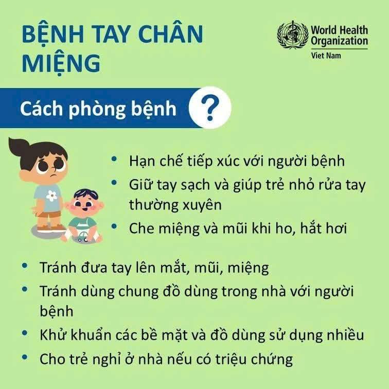 Ngành y tế khuyến cáo người dân cần giữ vệ sinh cá nhân, rửa tay thường xuyên, vệ sinh đồ dùng, hạn chế tiếp xúc với người bệnh và cho trẻ nghỉ học khi có triệu chứng. Khi phát hiện dấu hiệu nặng, cần đưa trẻ đến cơ sở y tế để được khám và điều trị kịp thời.
