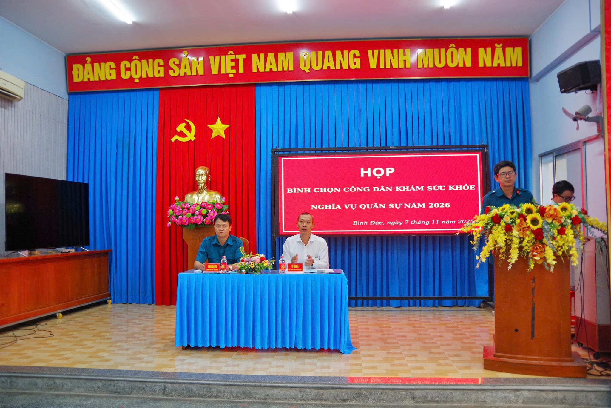 Trong 04 ngày từ ngày 06 đến ngày 09/11, Hội đồng Nghĩa vụ Quân sự phường Bình Đức tổ chức hội nghị bình chọn công dân đủ điều kiện gọi khám sức khỏe nghĩa vụ quân sự năm 2026 trên địa bàn 20 khóm. Tham dự có Ông Võ Văn Hòa - Phó Bí thư Đảng ủy phường, Chủ tịch UBND phường, Chủ tịch Hội đồng Nghĩa vụ Quân sự phường.