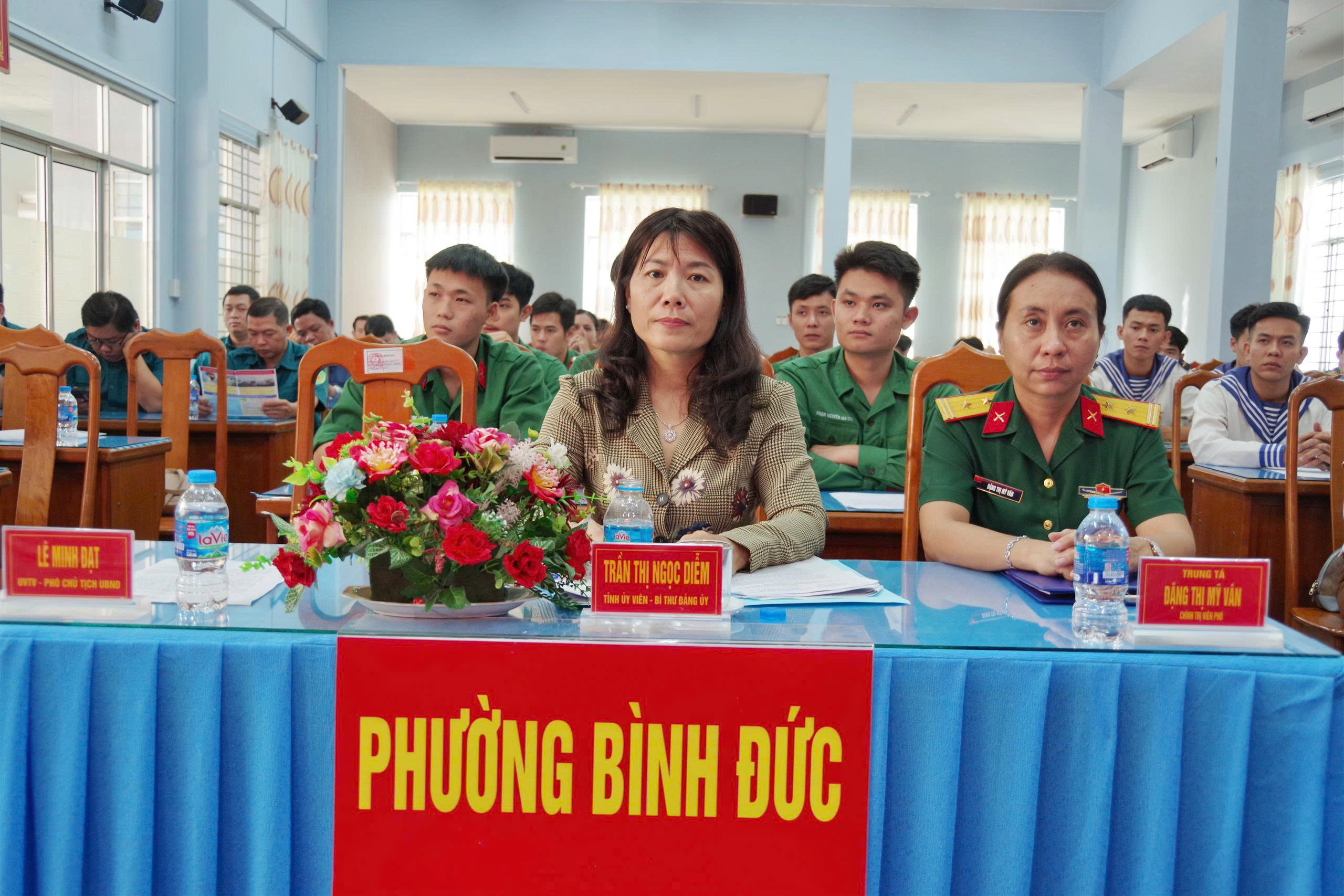 Phát biểu tại buổi lễ, đồng chí Trần Thị Ngọc Diễm – Tỉnh ủy viên, Bí thư Đảng ủy, Chủ tịch HĐND phường ghi nhận và biểu dương những nỗ lực, đóng góp của các quân nhân trong thời gian tại ngũ. Đồng thời mong muốn các quân nhân xuất ngũ tiếp tục phát huy phẩm chất “Bộ đội Cụ Hồ”, tích cực lao động, học tập, tham gia xây dựng quê hương Bình Đức ngày càng phát triển.
