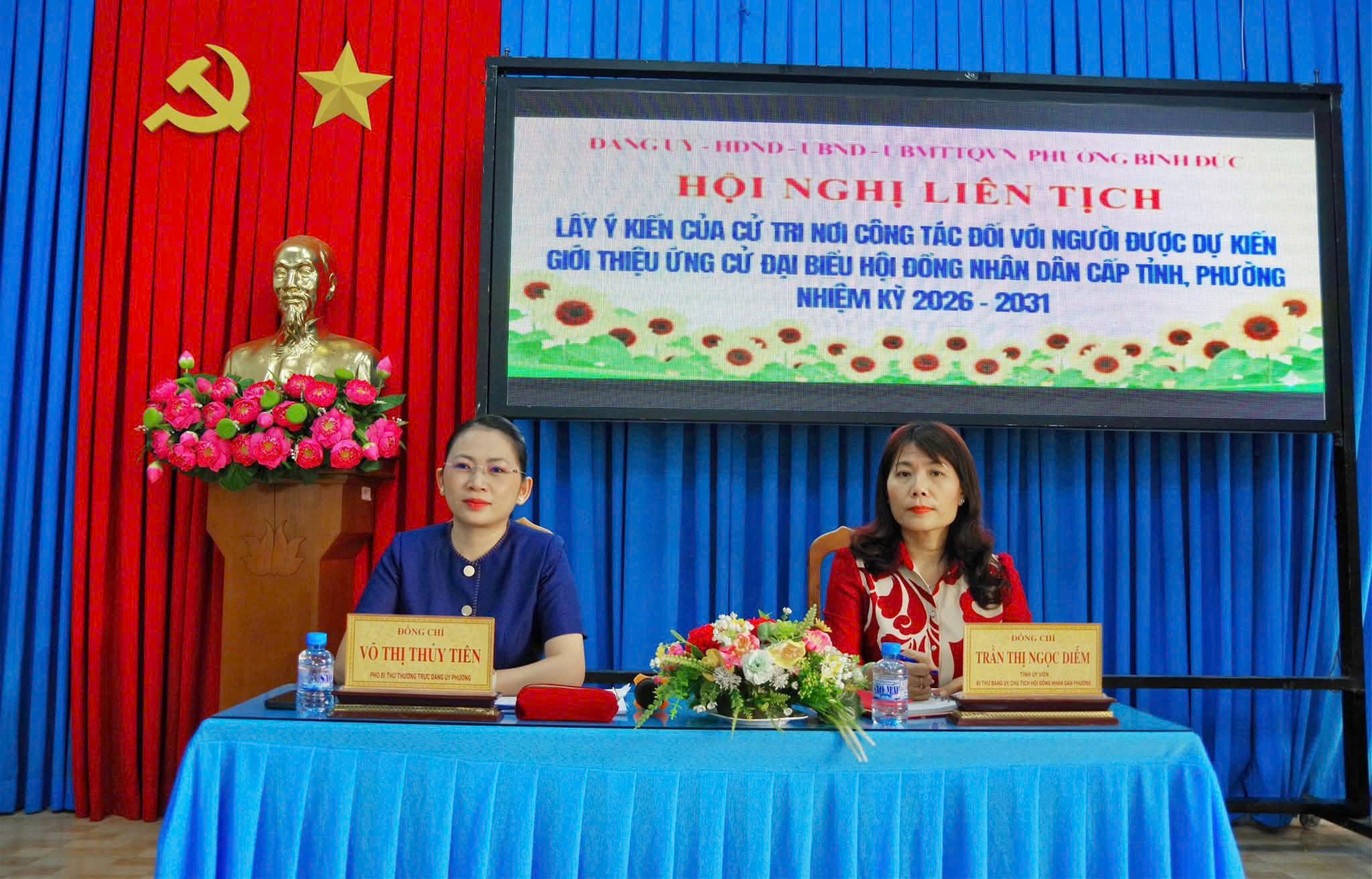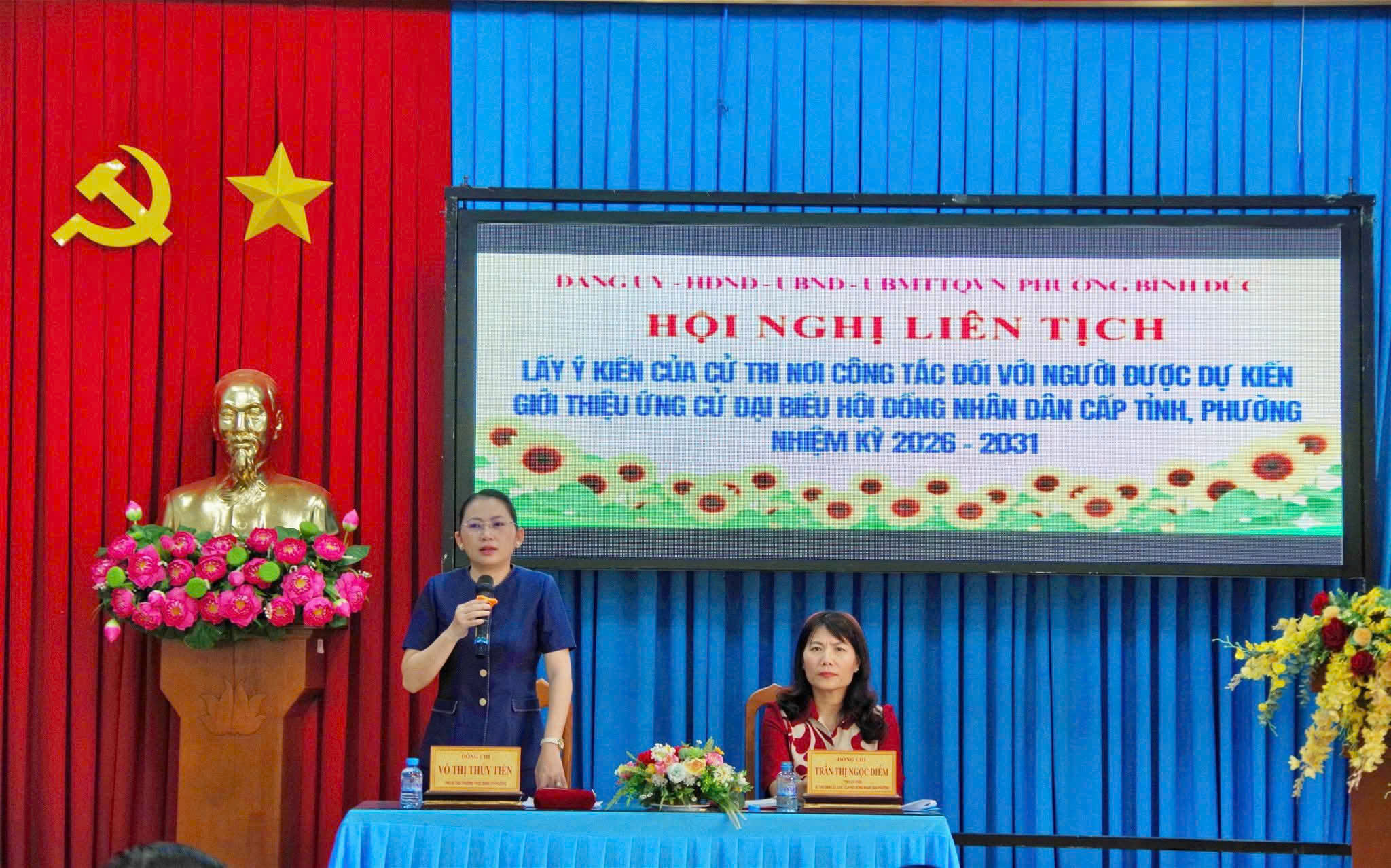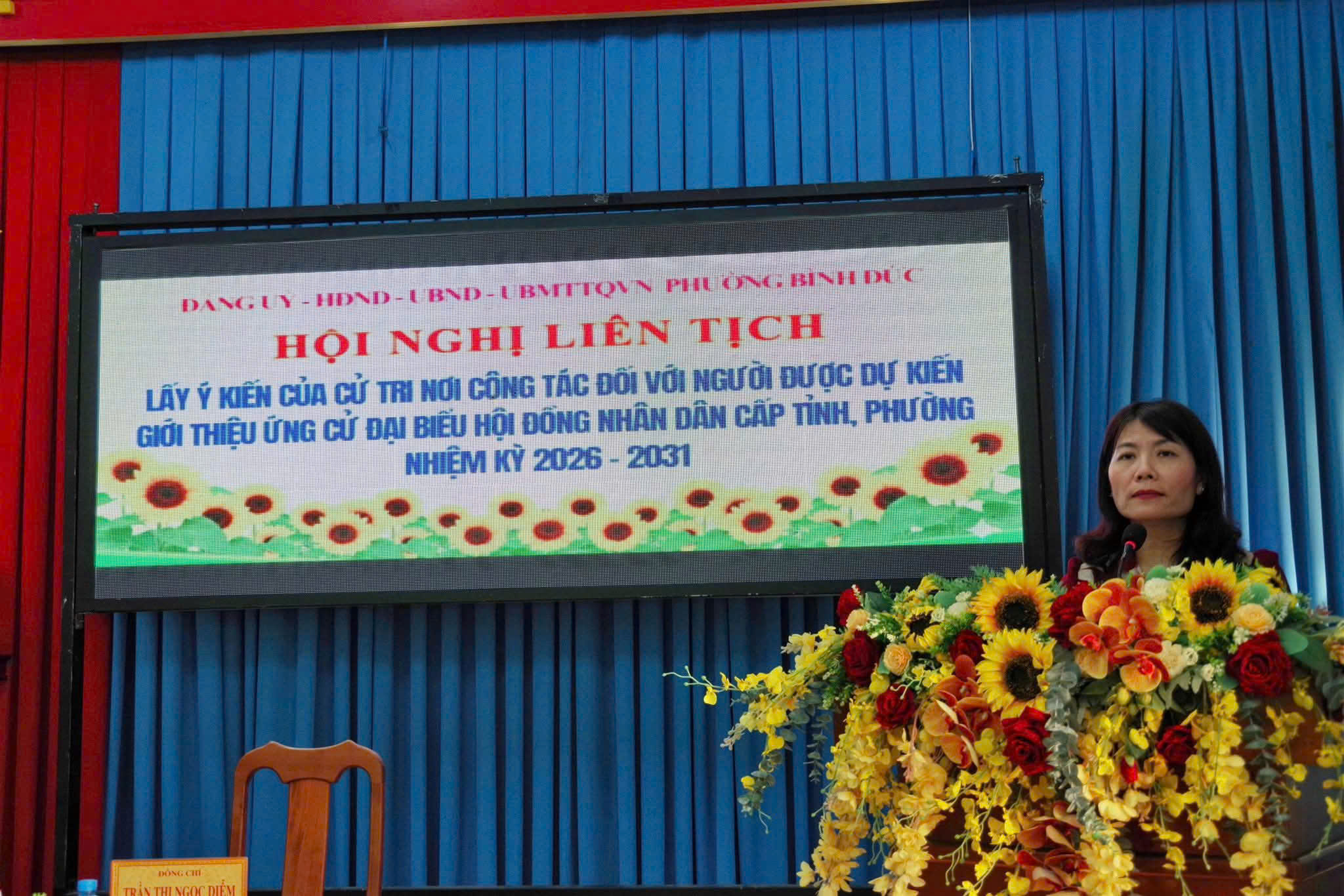 Sáng ngày 08/01, Đảng ủy, HĐND, UBND, Ủy ban MTTQVN phường Bình Đức tổ chức Hội nghị liên tịch lấy ý kiến của cử tri nơi công tác đối với người được dự kiến giới thiệu ứng cử đại biểu Hội đồng nhân dân cấp tỉnh, phường nhiệm kỳ 2026 – 2031. Tham dự hội nghị có đồng chí Trần Thị Ngọc Diễm - Tỉnh ủy viên, Bí thư Đảng ủy, Chủ tịch HĐND phường; đồng chí Võ Thị Thủy Tiên, Phó Bí thư Thường trực Đảng ủy phường.
