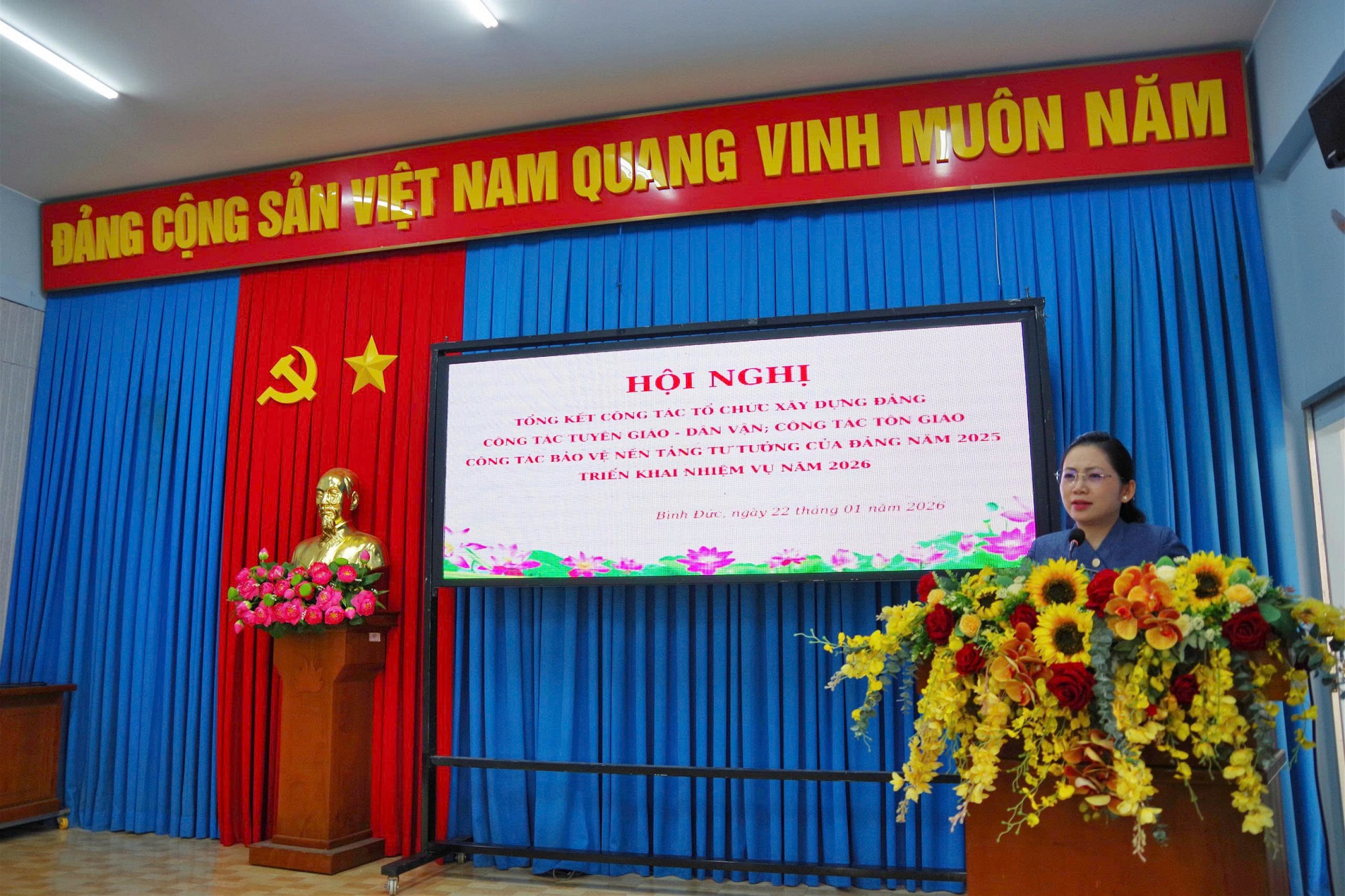 Sáng ngày 22/01, Ban xây dựng Đảng Đảng ủy phường Bình Đức, tỉnh An Giang tổ chức hội nghị tổng kết công tác tổ chức xây dựng Đảng; công tác Tuyên giáo - Dân vận; công tác tôn giáo năm 2025 và triển khai nhiệm vụ năm 2026. Tham dự có đồng chí Trần Thị Ngọc Diễm - Tỉnh ủy viên, Bí thư Đảng ủy, Chủ tịch HĐND phường; đồng chí Võ Thị Thủy Tiên - Phó Bí thư Thường trực Đảng ủy phường; đồng chí Võ Văn Hòa - Phó Bí thư Đảng ủy, Chủ tịch UBND phường.