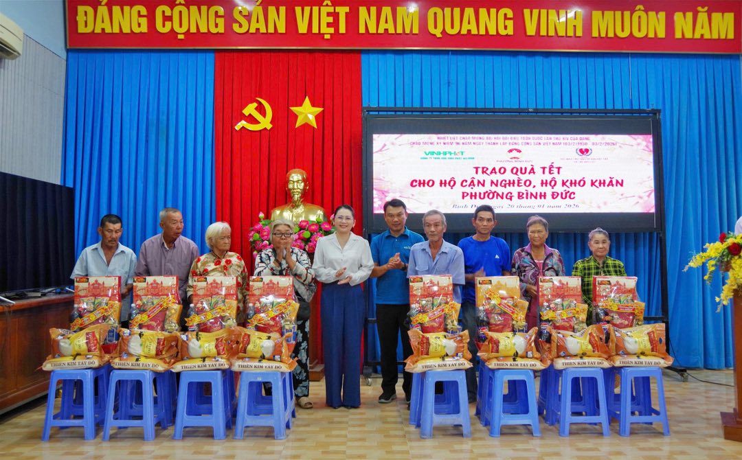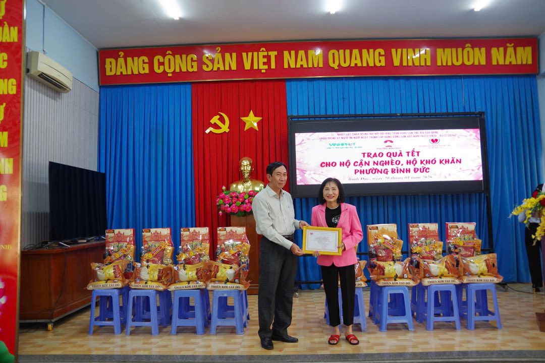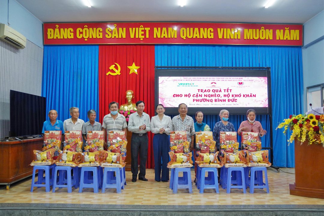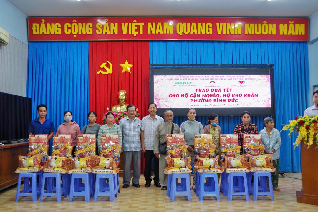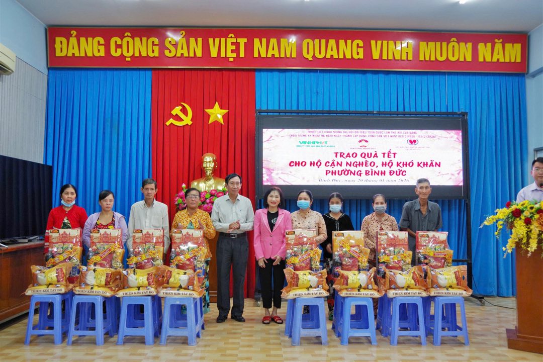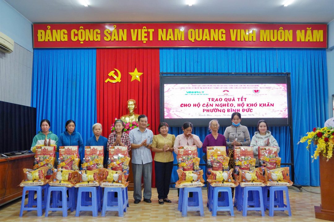 Nhằm thiết thực lập thành tích chào mừng Đại hội đại biểu toàn quốc lần thứ XIV của Đảng, đồng thời chào mừng kỷ niệm 96 năm ngày thành lập Đảng cộng sản Việt Nam (3/2/1930-3/2/2026). Chiều ngày 20/01, UBMTTQ Việt Nam phường Bình Đức phối hợp với Hội bảo trợ người tàn tật và trẻ mồ côi tỉnh An Giang, Công ty Trách nhiệm hữu hạn Gạo Vinh Phát và Tiệm vàng Kim Hương Dinh tổ chức trao 150 phần quà tết Bính Ngọ năm 2026 cho hộ cận nghèo và hộ khó khăn trên địa bàn phường. Đến dự có ông Trương Minh Thuần, chủ tịch Hội bảo trợ người tàn tật và trẻ mồ côi tỉnh; bà Võ Thị Thủy Tiên, Phó Bí thư Thường trực Đảng ủy phường; đại diện mạnh thường quân.