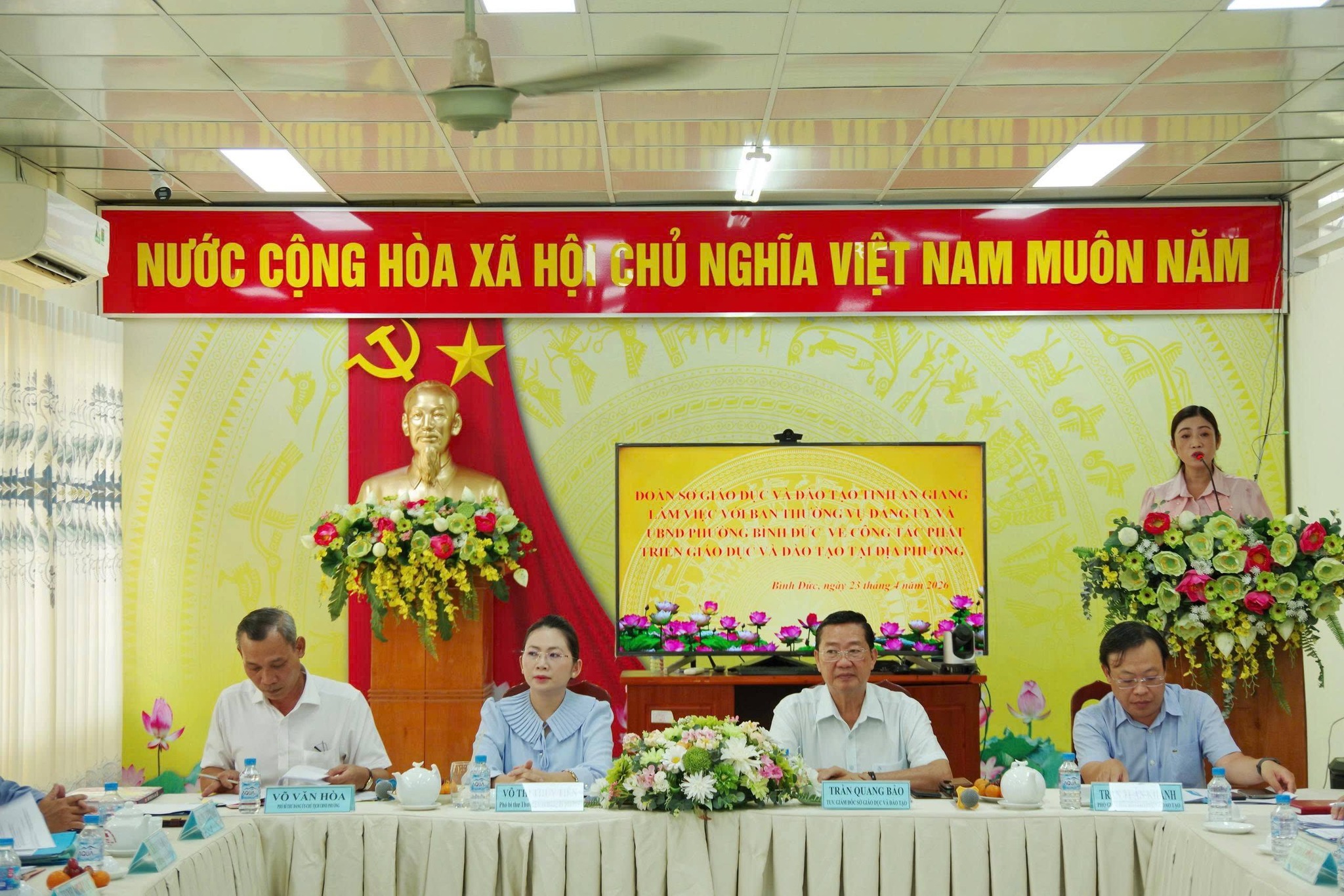 Chiều ngày 23/4, Đoàn công tác tỉnh An Giang do Ông Trần Quang Bảo, Giám đốc Sở Giáo dục và Đào tạo tỉnh làm trưởng đoàn có buổi làm việc với Ban Thường vụ Đảng ủy phường, UBND phường Bình Đức về công tác giáo dục và đào tạo trên địa bàn. Tiếp và làm việc với Đoàn có bà Võ Thị Thủy Tiên - Phó Bí thư Thường trực Đảng ủy phường; ông Võ Văn Hòa - Phó Bí thư Đảng ủy, Chủ tịch UBND phường.