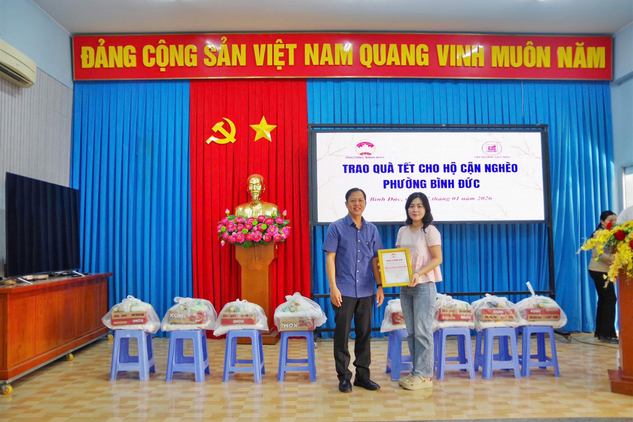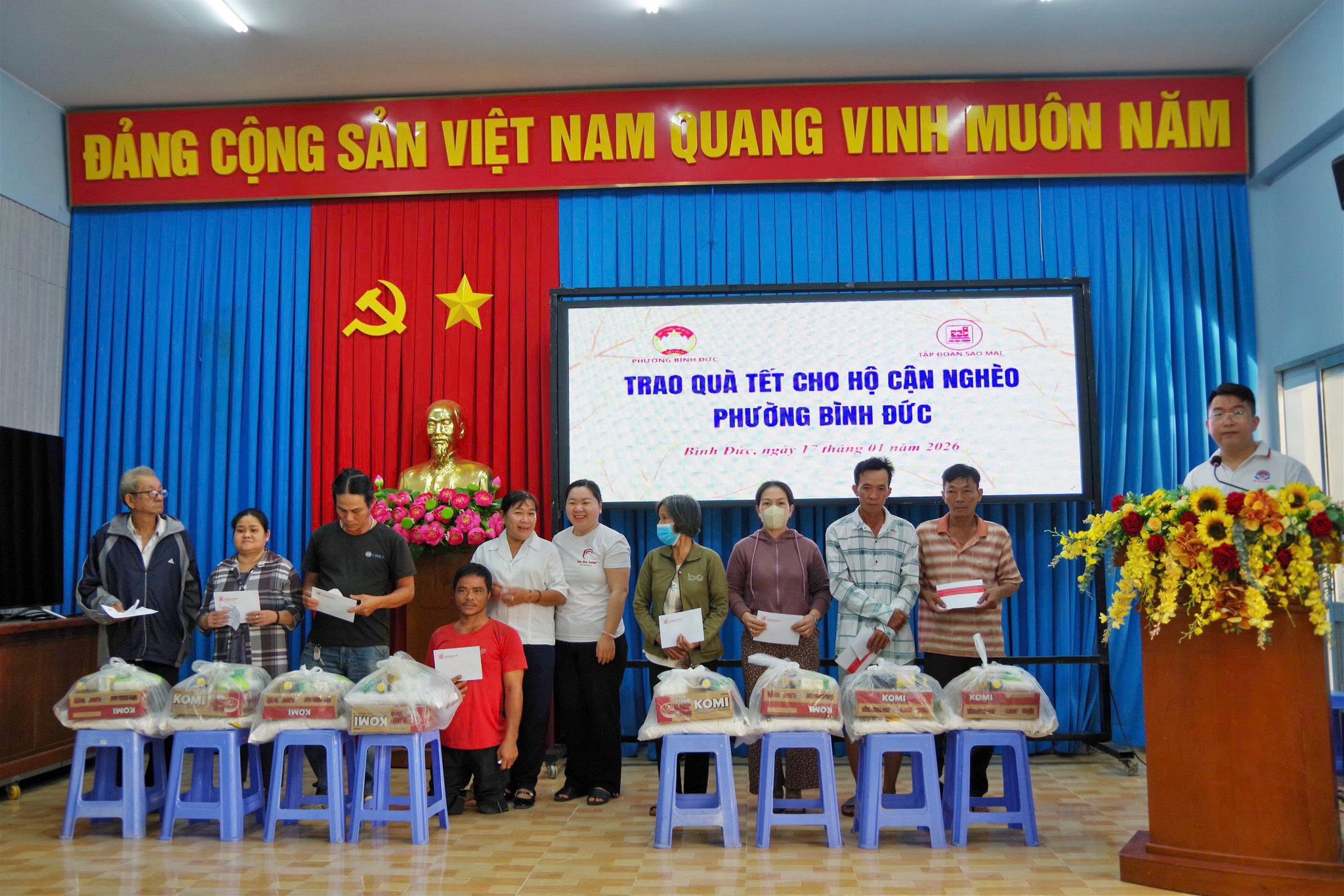 Thực hiện công tác chăm lo cho các hộ có hoàn cảnh khó khăn, hộ cận nghèo trên địa bàn phường Bình Đức trong dịp tết Nguyên đán Bính Ngọ 2026. Sáng ngày 17/01, Tập đoàn Sao Mai phối hợp UBND phường Bình Đức tổ chức buổi lễ phát 320 phần quà tết cho các hộ cận nghèo, hộ có hoàn cảnh khó khăn trên địa bàn phường. Đến dự lễ phát quà có bà Trần Thị Ngọc Diễm, Bí thư Đảng ủy – Chủ tịch HĐND phường, đại diện lãnh đạo Tập đoàn Sao Mai cùng tham dự.