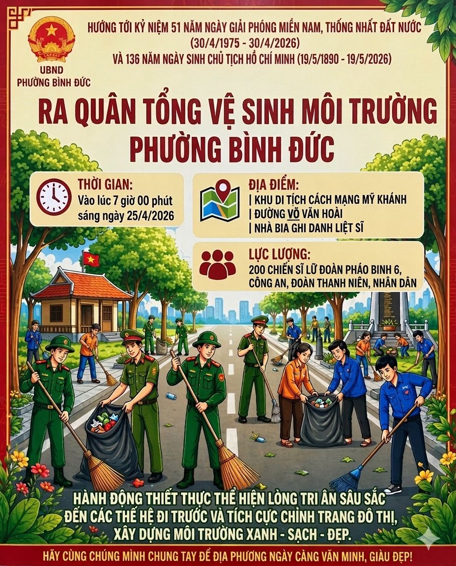 Hướng tới kỷ niệm 51 năm Ngày Giải phóng miền Nam, thống nhất đất nước (30/4/1975-30/4/2026) và 136 năm Ngày sinh Chủ tịch Hồ Chí Minh (19/5/1890-19/5/2026), UBND phường Bình Đức tổ chức ra quân tổng vệ sinh môi trường.
