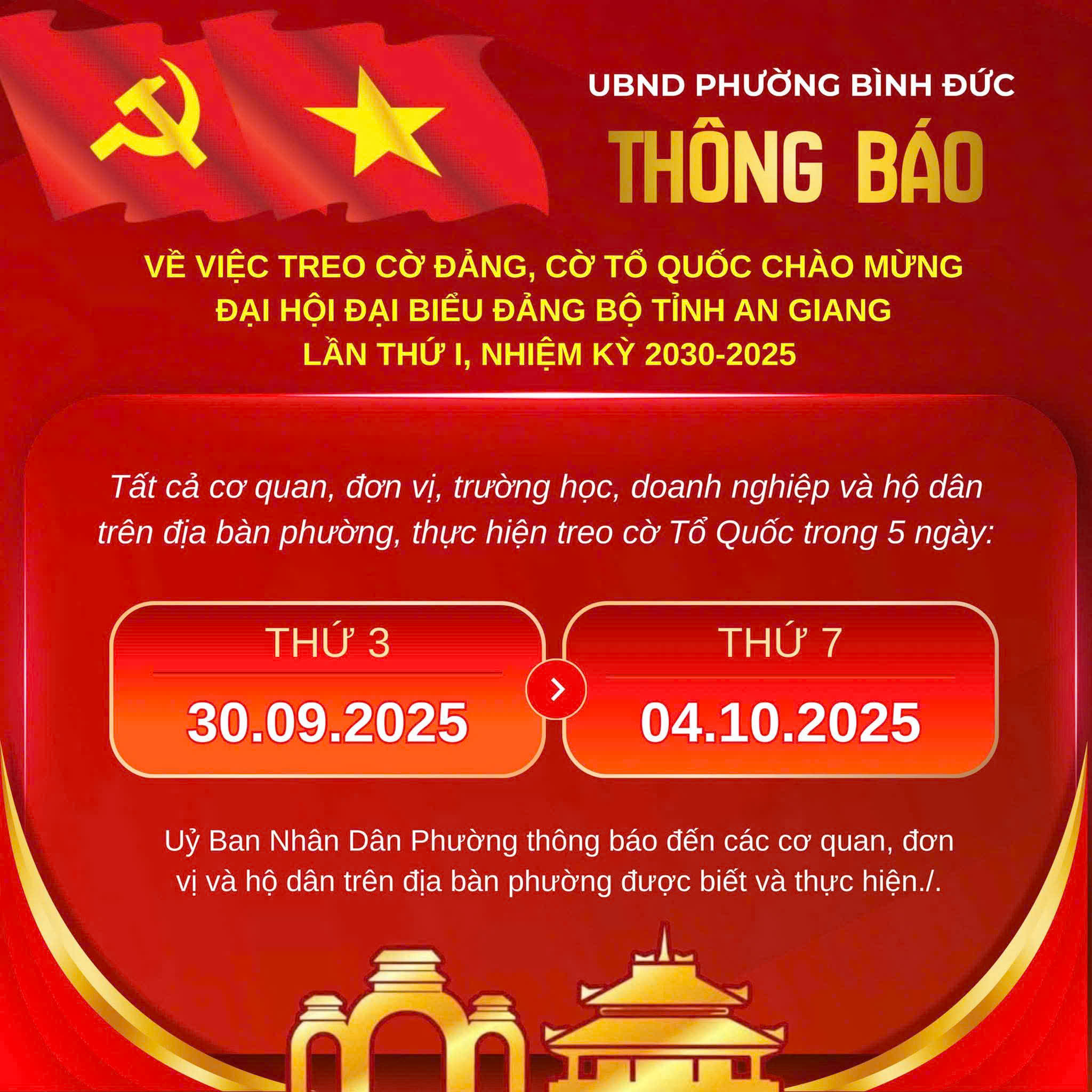 Thông báo treo cờ Đảng, cờ Tổ quốc chào mừng Đại hội đại biểu Đảng bộ tỉnh An Giang lần thứ I, nhiệm kỳ 2025-2030