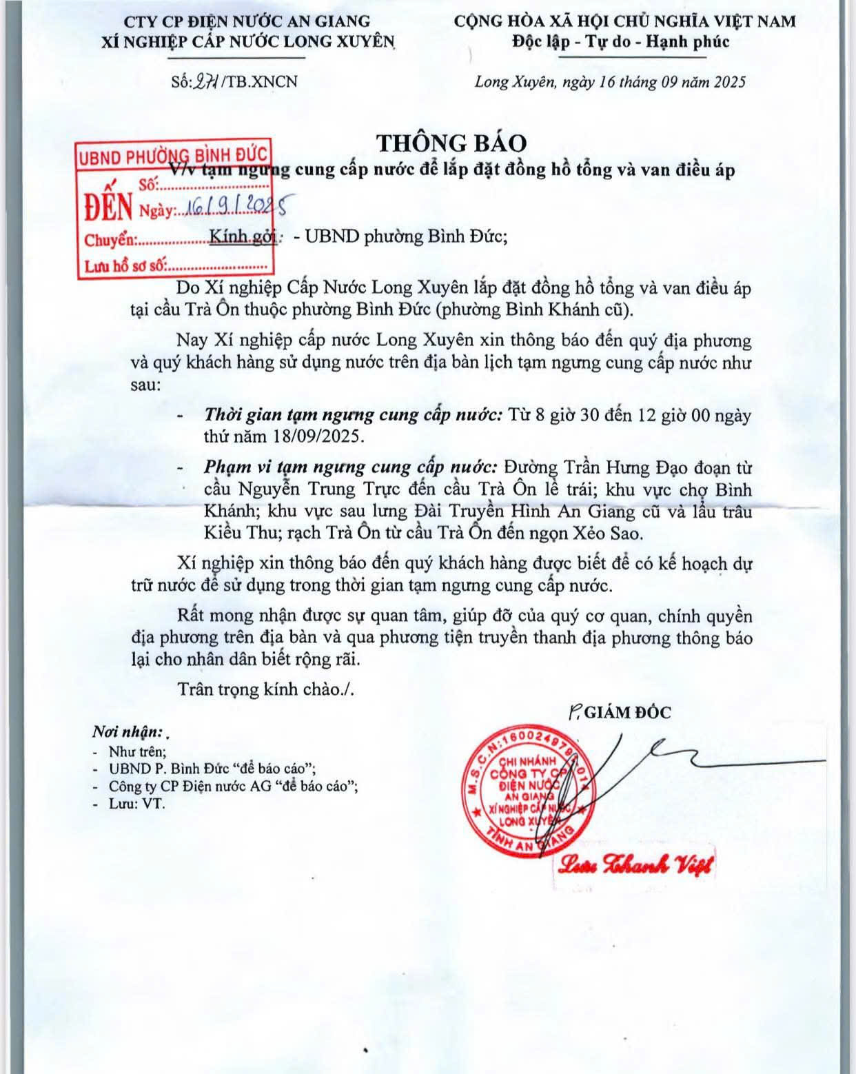 THÔNG BÁO VỀ VIỆC TẠM NGƯNG CUNG CẤP NƯỚC TRÊN ĐỊA BÀN PHƯỜNG BÌNH ĐỨC