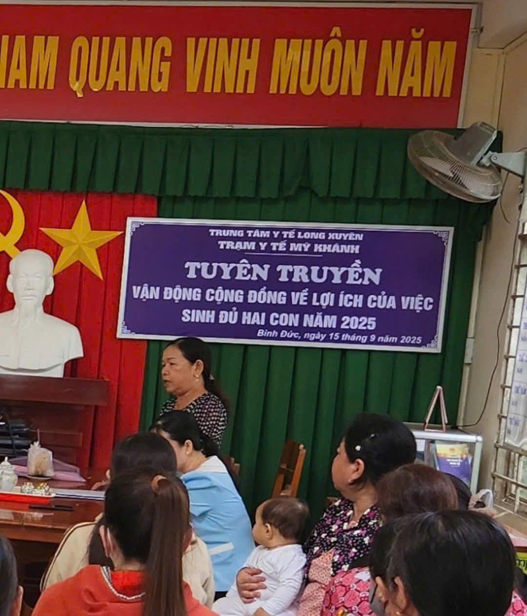 Chiều ngày 15/9/2025, tại văn phòng khóm Bình Hòa 1, Trạm y tế Mỹ Khánh tổ chức buổi tuyên truyền vận động cộng đồng về lợi ích của việc sinh đủ 02 con cho người dân trong cộng đồng khóm Bình Hòa 1, phường Bình Đức.