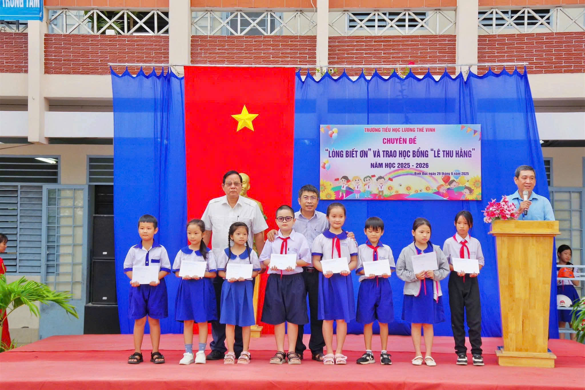 Nhằm tiếp thêm động lực cho các em học sinh có hoàn cảnh khó khăn vươn lên trong học tập. Sáng ngày 29/9, trường Tiểu học Lương Thế Vinh, phường Bình Đức tổ chức trao học bổng Lê Thu Hằng cho học sinh có hoàn cảnh khó khăn, năm học 2025-2026. Đến dự có Ông Nguyễn Tấn Danh, đại diện lãnh đạo Hội khuyến học tỉnh An Giang, ông Dương Kiếm Anh – UVTV, Phó Chủ tịch UBND phường.